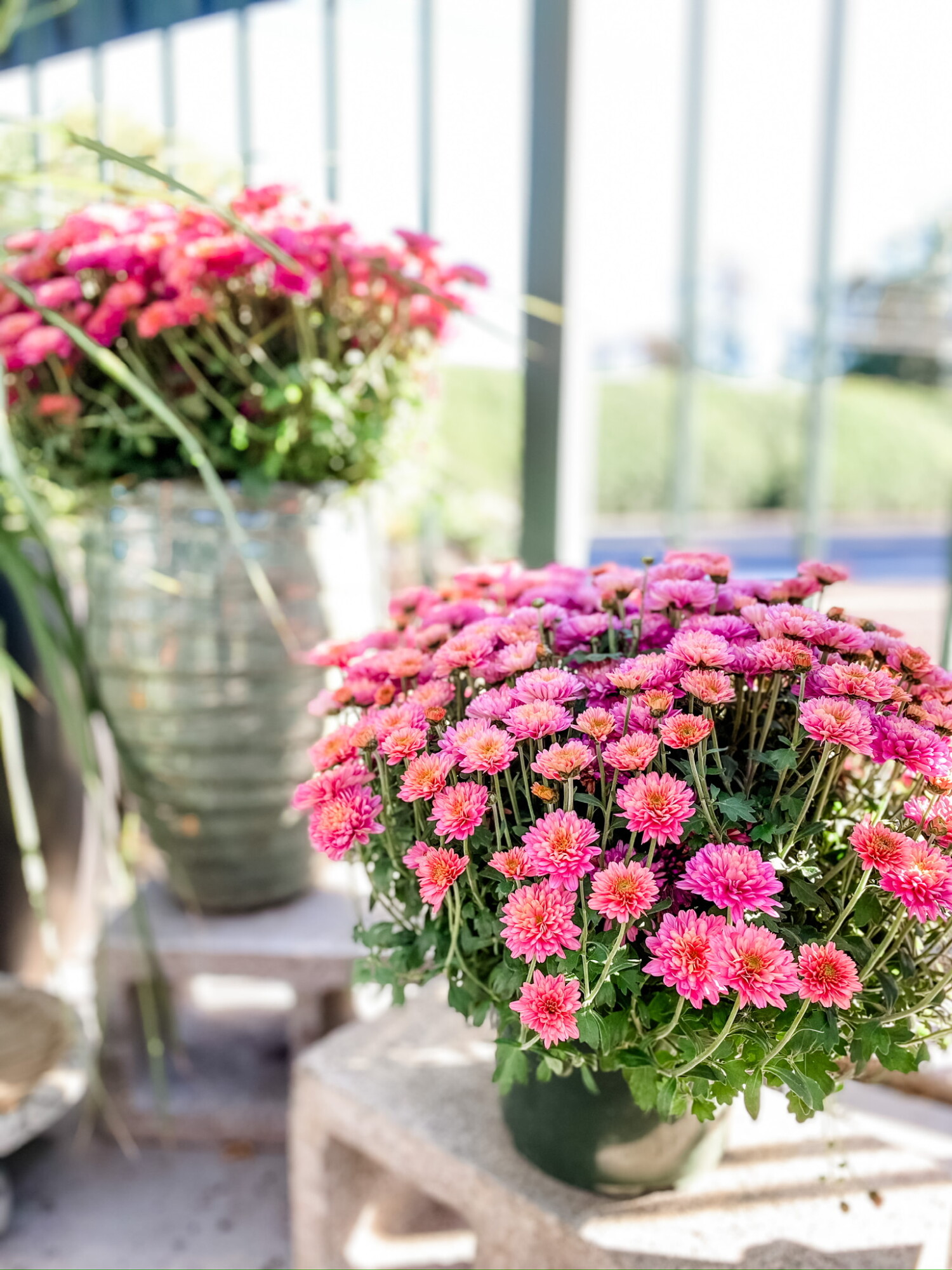 A note on mums: though beautiful, Chrysanthemums don’t last as long as some other fall blooms. To extend their beauty, I like to “plant” them in their original containers, allowing for easy replacement once their buds have run their course.